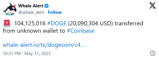 A massive Dogecoin (DOGE) transfer of 104,125,016 DOGE, valued at approximately $20 million, has been moved to Coinbase, one of the largest U.S.-based cryptocurrency exchanges.