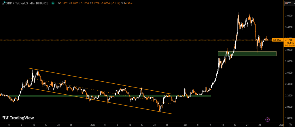 In a surprising twist, whale accumulation has intensified. On July 25 alone, more than 130 million XRP were acquired at lower prices, as per on-chain analyst Ali.