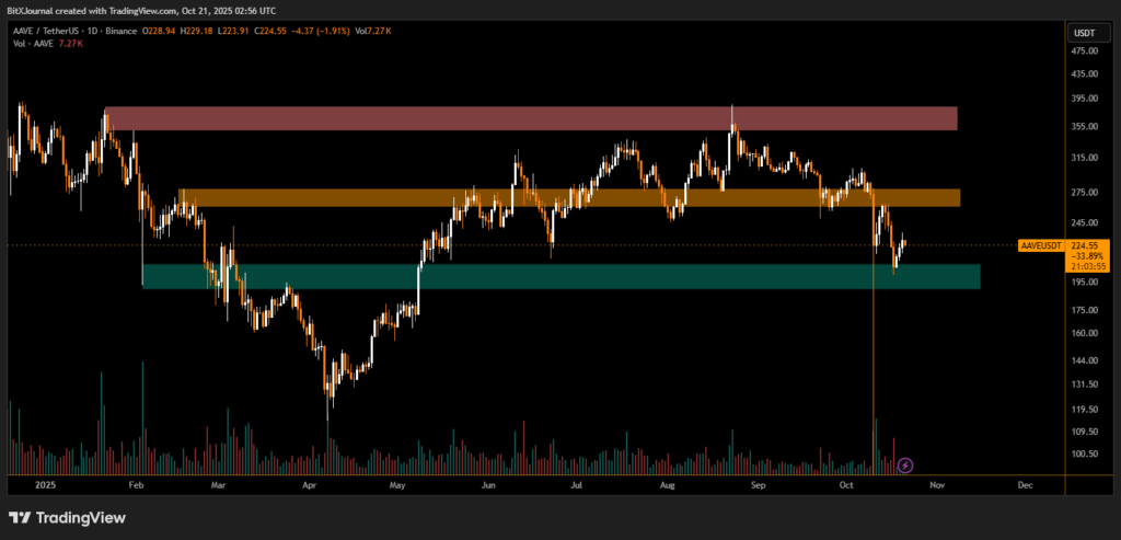 “AAVE has shown strong resilience around the $200 support area, which historically acts as a launch point for medium-term rallies,” said BITX market strategist. “If the token holds above $220 and volume remains consistent, the next target sits near $275.”