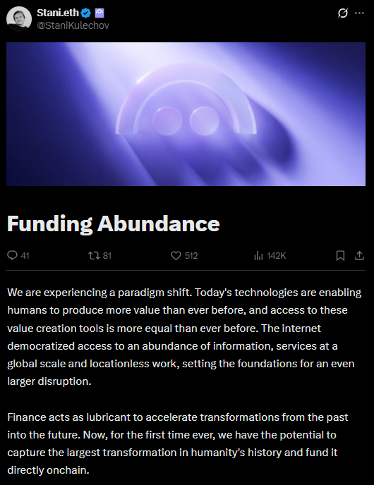Stani Kulechov, founder of Aave, believes decentralized finance could unlock up to $50 trillion in tokenized “abundance assets” by 2050, reshaping how capital flows into infrastructure and emerging technologies.