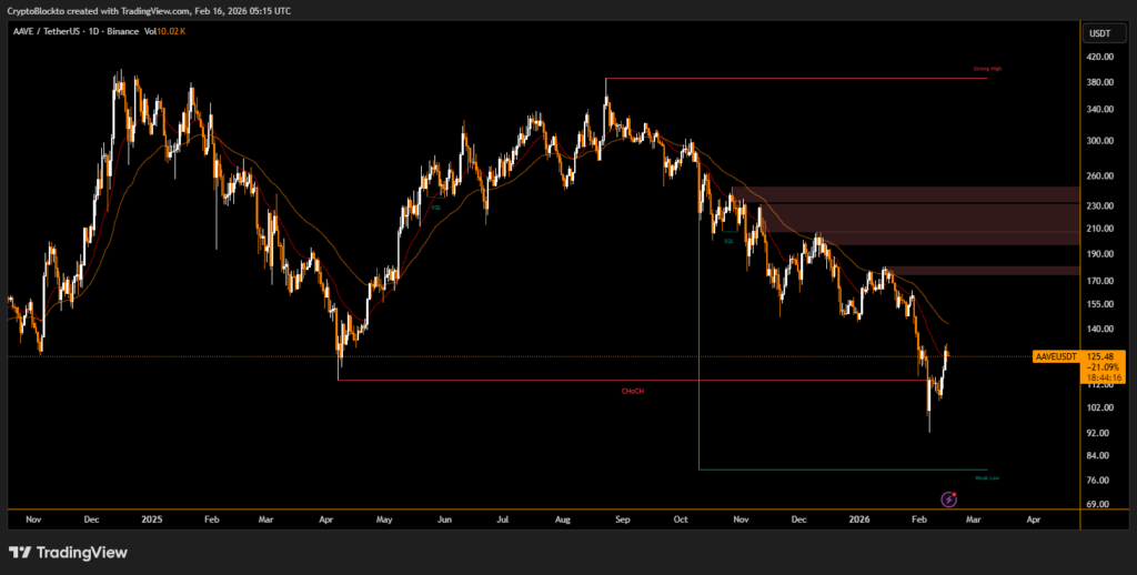 Aave remains the largest DeFi lending protocol with roughly $27 billion in total value locked. However, the AAVE token trades near $126, down over 15% in 2026 and about 81% below its 2021 peak, reflecting broader crypto market weakness.