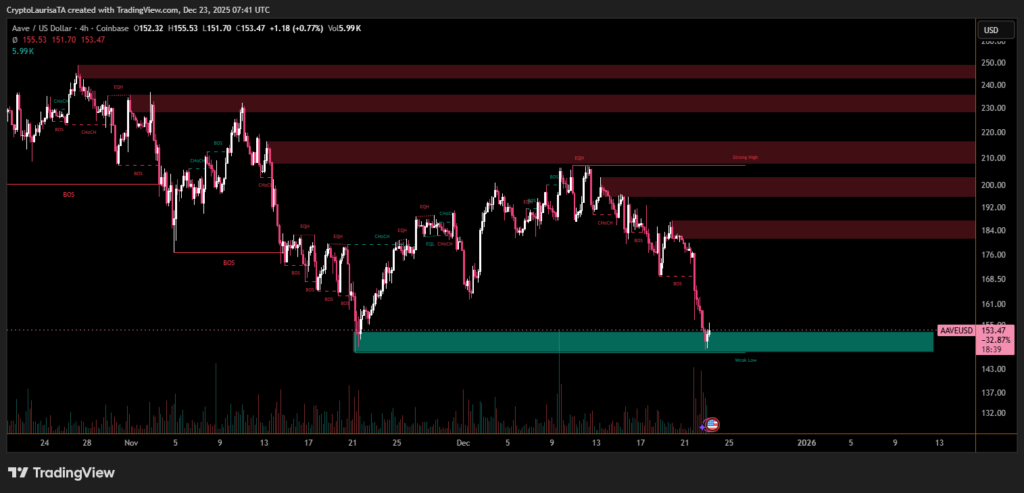 Aave has recorded a sharp downturn, with the AAVE token falling nearly 19% over the past week, underperforming most major cryptocurrencies. The decline has pushed price into a critical demand zone, reflecting heightened selling pressure that intensified as a contentious governance proposal advanced to a Snapshot vote.