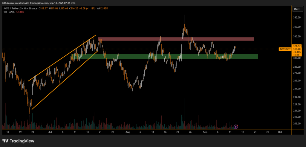 “This consolidation between $300 and $340 is setting the stage for AAVE’s next decisive move,” According to BITX analysts. “A breakout above resistance would signal strength, while a breakdown under $300 could shift momentum back to the sellers.”