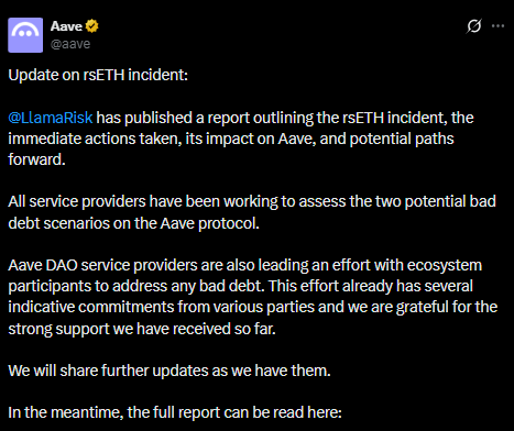 The second scenario shifts all losses to layer 2 networks such as Arbitrum and Mantle, increasing potential bad debt to approximately $230.1 million but reducing risks to Ethereum mainnet. Aave’s treasury, holding about $181 million, may also be used to manage the financial impact as Kelp DAO continues working with partners to determine the safest recovery path.
