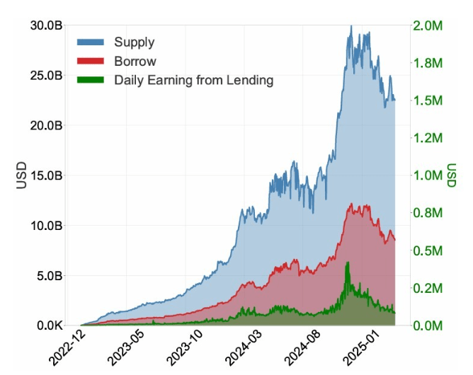 Daily lending earnings, circulating supply, and borrowing volumes (USD) on Aave V3
