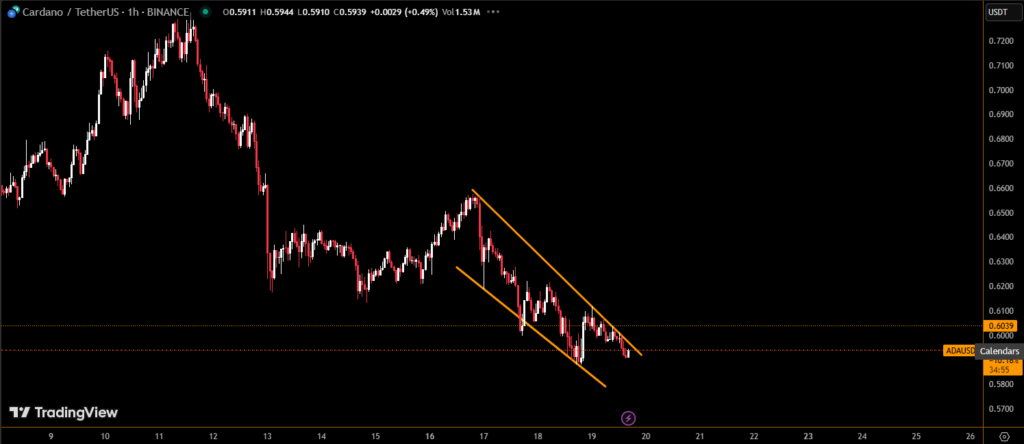 ADA fell to $0.5965, breaching a critical support level at $0.60 that had held earlier in the day. The move invalidated a possible bullish reversal setup, including a developing triple bottom pattern, which typically indicates a potential rebound.