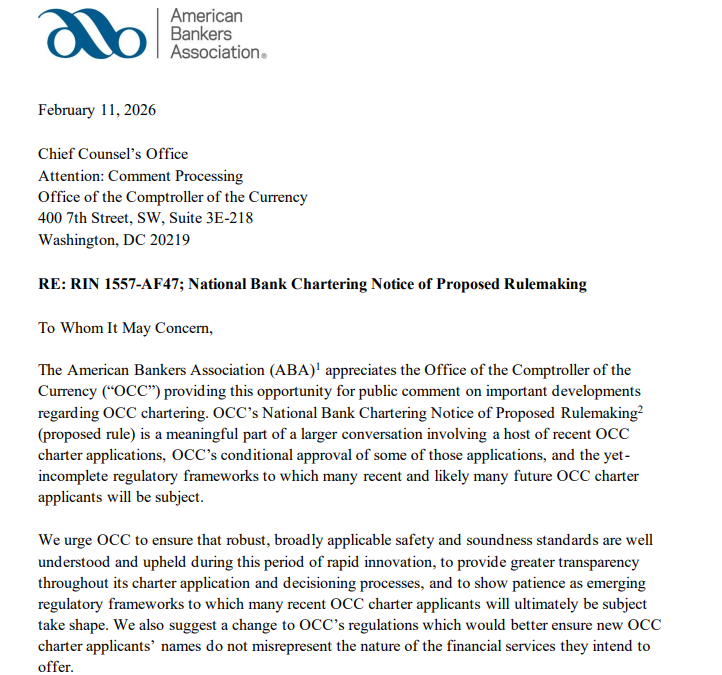 In a formal comment letter addressing the OCC’s proposed updates to national bank chartering rules, the ABA argued that applications tied to digital assets and stablecoins should not move forward while oversight responsibilities remain unsettled.