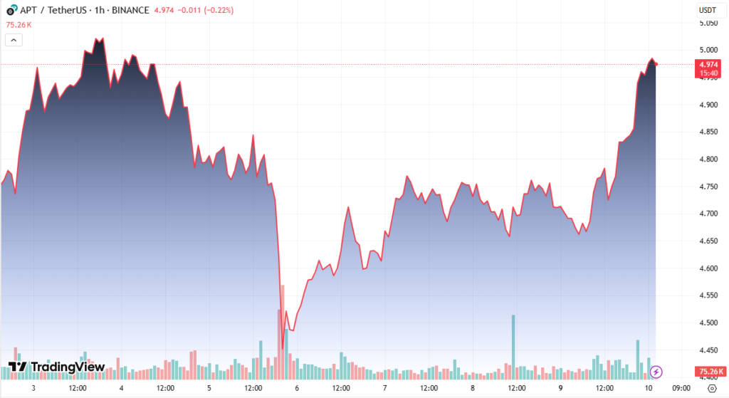 The APT token climbed more than 4.3%, moving from $4.65 to $4.85, backed by significant trading volume. The asset broke out of a consolidation zone between $4.65 and $4.73, with the breakout occurring around 09:00, when volume nearly doubled the 24-hour average.