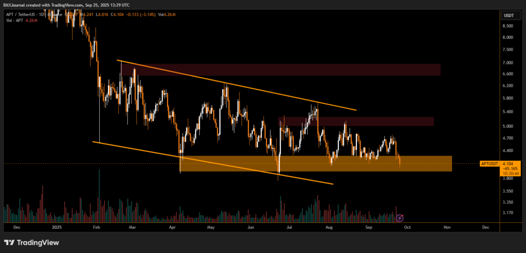 The daily chart shows APT locked inside a descending channel since February 2025, with both lower highs and lower lows guiding the trend. The resistance line has consistently capped recovery attempts near the $5.50–$6.80 zone, while sellers have pushed prices back into consolidation ranges.