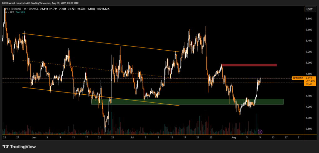 The recovery follows a period of sustained selling pressure that pushed APT towards the lower end of its recent trading range. The sharp bounce from the green support zone on the chart signals renewed market confidence. A break above the red resistance zone could pave the way for a retest of the $5.00 psychological level, a price point that has historically attracted strong selling interest.