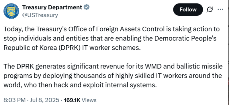 This case isn’t isolated. The Treasury Department recently sanctioned two individuals and four entities linked to similar DPRK-run IT rings. In another instance, four North Koreans infiltrated a U.S. crypto startup and a Serbian blockchain firm, stealing over $900,000.