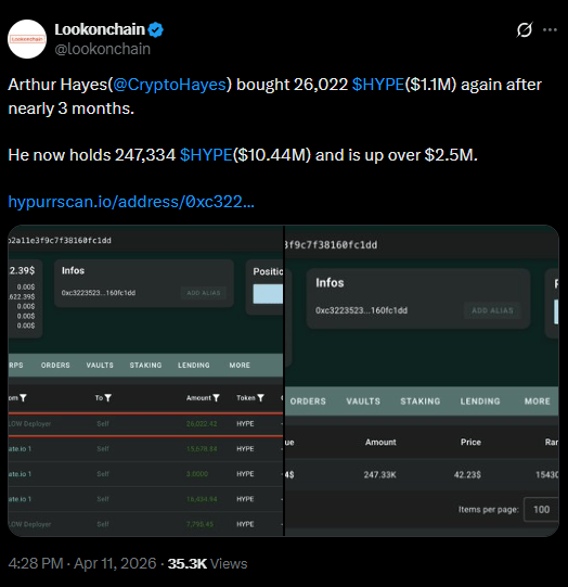 Crypto entrepreneur Arthur Hayes has resumed buying HYPE tokens, acquiring 26,022 HYPE valued at approximately $1.1 million after a pause lasting nearly three months. The purchase was identified through Lookonchain tracking data, marking his first accumulation since early 2026 and signaling renewed confidence in the asset.