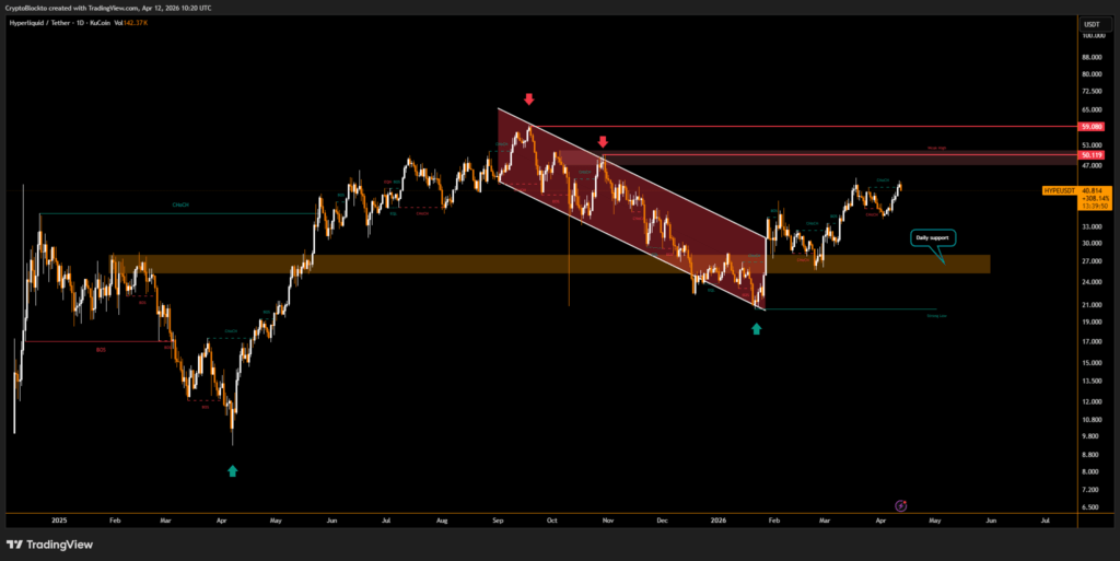 Over the past year, HYPE has gained roughly 176%, making it one of the strongest-performing large-cap tokens. However, short-term pressure remains, with the token slipping around 2% in the past 24 hours to approximately $40.91, influenced partly by geopolitical uncertainty following unsuccessful U.S.–Iran negotiations.