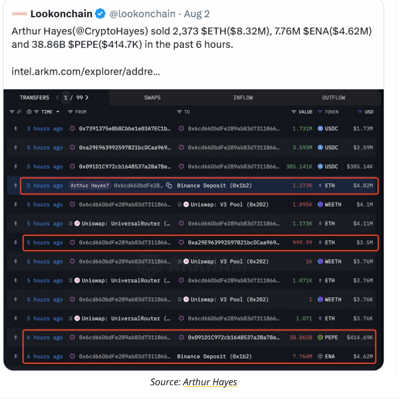 Bitcoin (BTC) could slide back toward $100,000, while Ethereum (ETH) may revisit the $3,000 level, according to Arthur Hayes, Chief Investment Officer of Maelstrom Fund. Citing mounting macroeconomic pressures, Hayes has taken profits and rebalanced his crypto portfolio.