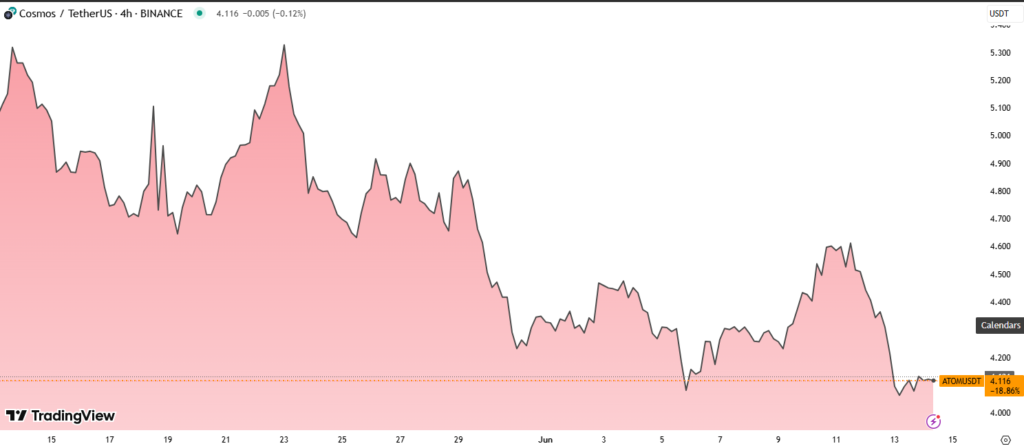 Cosmos (ATOM) tumbled 9.25% in the last 24 hours, dropping from $4.43 to an intraday low of $4.02, as the broader crypto market responded to heightened Middle East tensions. The sharp decline followed reports that Israel launched a bombing campaign in Iran, igniting widespread panic across risk assets.