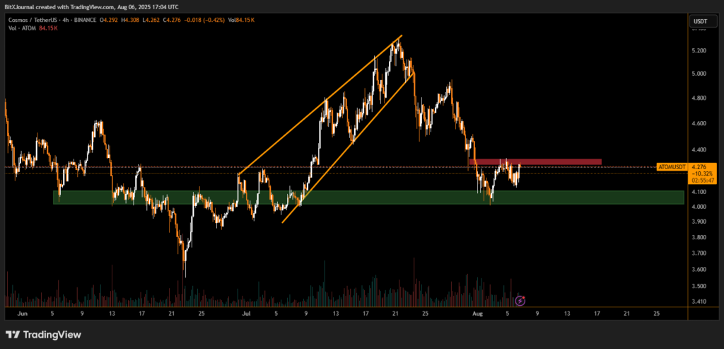 If ATOM closes above $4.35 with volume, it could signal a short-term reversal back toward the $4.60–$4.80 zone. However, failure to break above the red resistance may result in further range-bound trading between $4.05 and $4.30, as the market awaits a catalyst.
