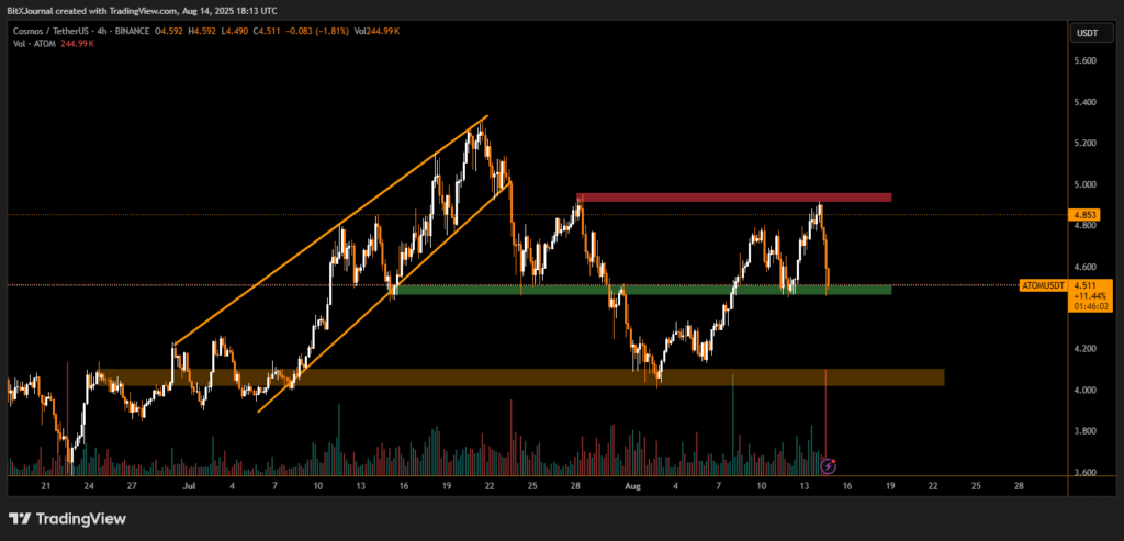 The price action follows an earlier rally in July, when ATOM broke out of an ascending channel and reached its late-month peak. However, repeated rejections near the $4.91–$4.95 resistance band, highlighted in red on the chart, have limited further upside.