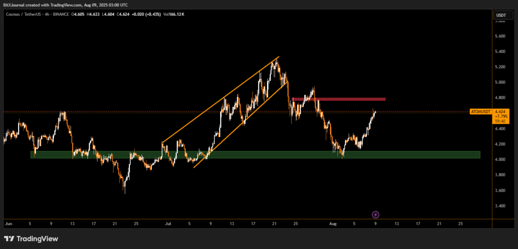 On the 4-hour chart, ATOM surged from the $4.05–$4.15 support zone (green area) with strong momentum, propelled by above-average trading volume. The breakout lifted the token past its short-term ceiling, touching highs near $4.78 before sellers stepped in. The rejection has now established $4.75–$4.80 as a critical barrier for the next upside push.