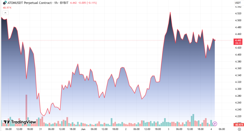 The technical setup points to shifting trader sentiment. After a breakout above resistance at $4.42, ATOM established strong short-term support in the $4.43–$4.44 range. However, this zone was tested repeatedly and eventually failed to sustain, weakening bullish control.