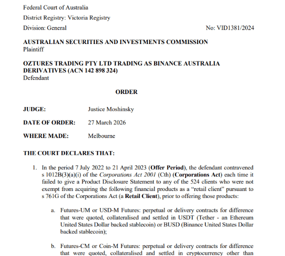Court order against Binance Australia Derivatives