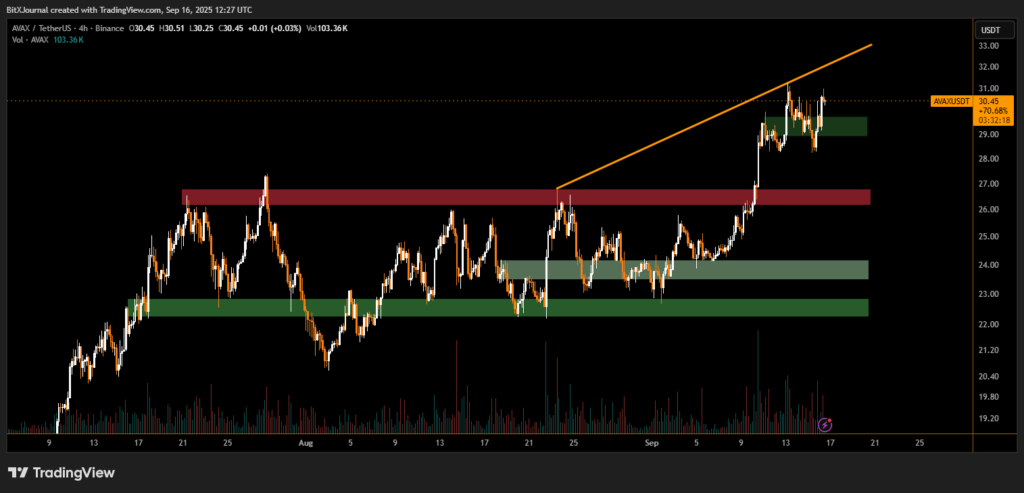 On the 4-hour chart, AVAX has respected its ascending trendline, with each higher low reinforcing bullish sentiment. The move above the $27 resistance area earlier this month marked a turning point, allowing buyers to push the price back toward the $30–$31 range.
