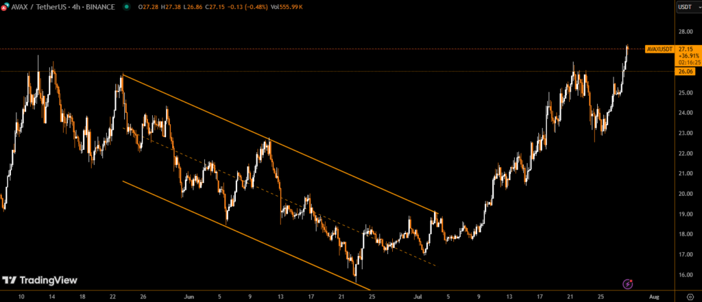 The price rally pushed AVAX above the $27 mark, closing in on key resistance levels last tested in early Q2 2025. The surge came amid a broader rally across the crypto market, with risk sentiment improving across both digital and traditional assets.
