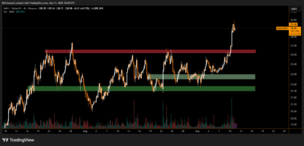 At the time of writing, AVAX is trading at $28.8, marking a 16% surge over the past week. Despite being well below its all-time high of $135 set in November 2021, Avalanche has recently attracted attention from institutional players. In August, Grayscale Investments filed for a spot Avalanche ETF, signaling growing demand from traditional finance.