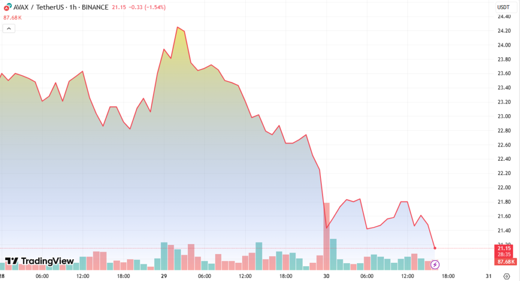 Analysts note that multiple support tests around $21.45–$21.47 suggest the formation of a short-term consolidation zone. If AVAX can maintain this support and break above $21.88, it could retest the $22.35 resistance level. Failure to hold current levels may trigger further downside.