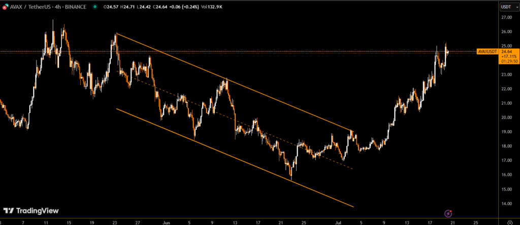 According to recent technical analysis, AVAX has broken out of a multi-month descending channel, a chart pattern often seen as a sign of trend reversal. The breakout occurred on above-average volume, suggesting that buyers are stepping in with strength at key levels.