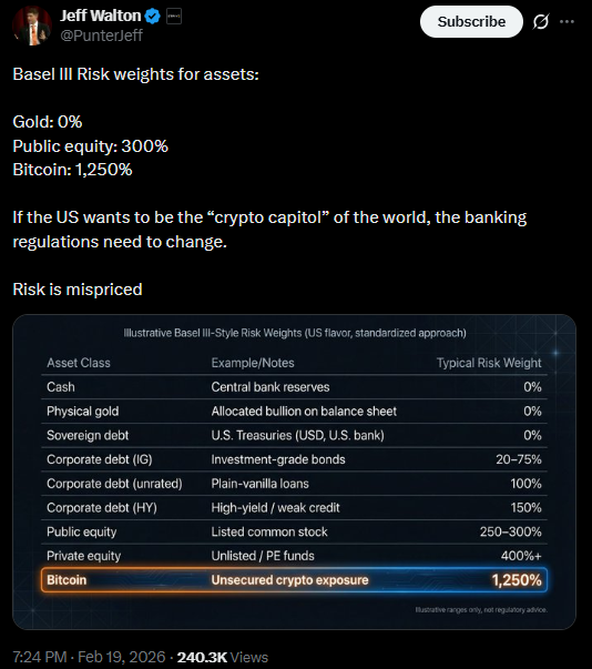 Currently, the Basel capital rules assign Bitcoin and similar digital assets a 1,250% risk weight. This classification requires banks to hold reserve capital equal to the full value of any Bitcoin exposure on their balance sheets. Analysts say such requirements make it extremely costly for banks to hold BTC directly or offer related services.