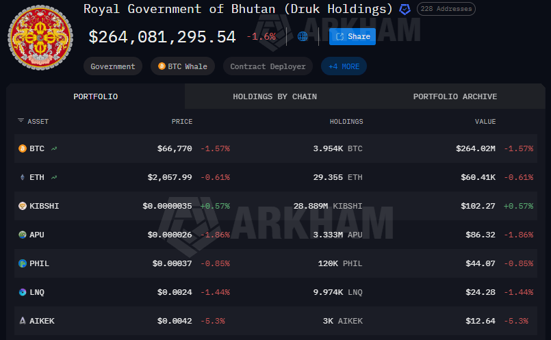 Despite the transfers, Bhutan still holds around 3,954 BTC valued near $263.9 million, according to Arkham data. The reserves are managed by Druk Holding & Investments, Bhutan’s state investment arm. Bhutan built its holdings primarily through hydroelectric-powered bitcoin mining, though analysts noted that no major inflows above $100,000 have been recorded in more than a year, raising speculation about whether mining activity has slowed.