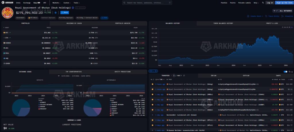 Bhutan’s remaining balance is estimated at around 3,774 BTC, valued near $272.5 million at current market prices. This represents a significant decline from its peak holdings of nearly 13,000 BTC recorded in October 2024, marking a drawdown of more than 70%.