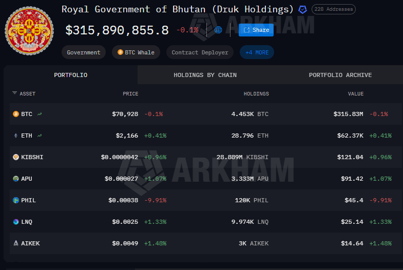 Following the latest movement, Bhutan retains 4,453 BTC, valued at roughly $315.89 million. The holdings are managed by Druk Holding and Investments Ltd., which oversees the nation’s digital asset strategy.