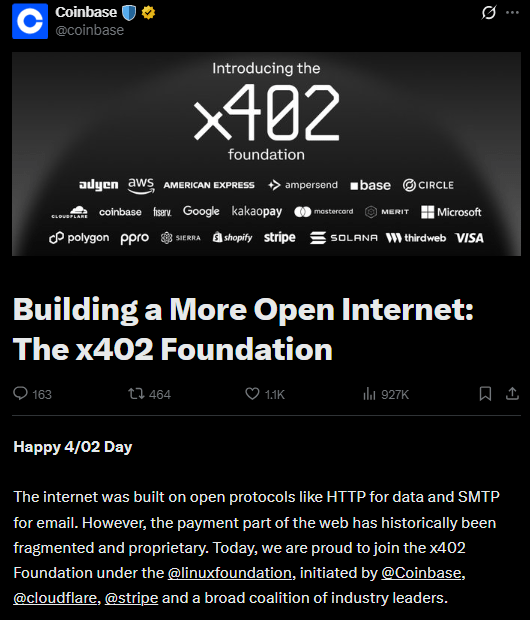 The Linux Foundation officially launched the x402 Foundation on Thursday with support from Coinbase, which originally developed the x402 protocol. Other founding participants include American Express, Mastercard, Visa, Cloudflare, Shopify, Stripe, Circle, Polygon Labs, Solana Foundation, Thirdweb, and KakaoPay.