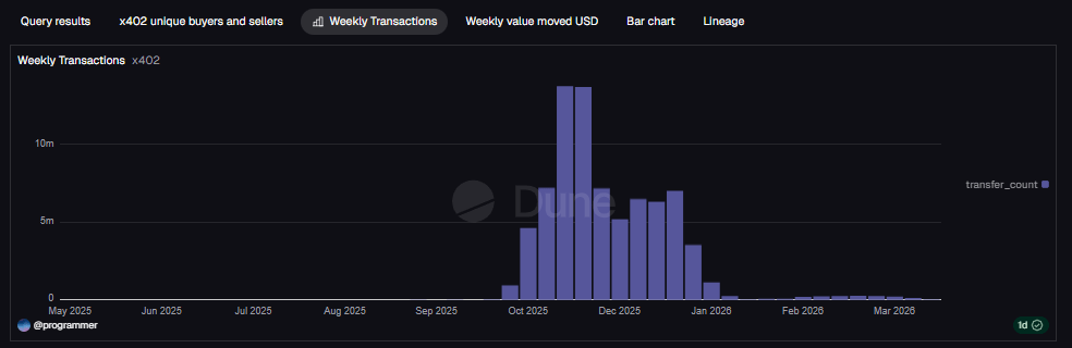 Data from analytics platform Dune Analytics showed that x402 protocol usage surged in late 2025 before declining in early 2026. Weekly transaction volume peaked between Nov. 4 and Nov. 10, reaching approximately 13.7 million transactions, followed by another 13.66 million transactions the next week.