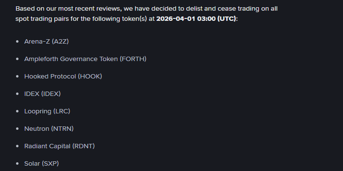 Binance has confirmed that it will cease trading and delist Arena-Z (A2Z), Ampleforth Governance Token (FORTH), Hooked Protocol (HOOK), IDEX (IDEX), Loopring (LRC), Neutron (NTRN), Radiant Capital (RDNT), and Solar (SXP) on April 1, 2026. Spot trading, margin, futures, and other associated products for these tokens will be affected according to Binance’s delisting schedule.