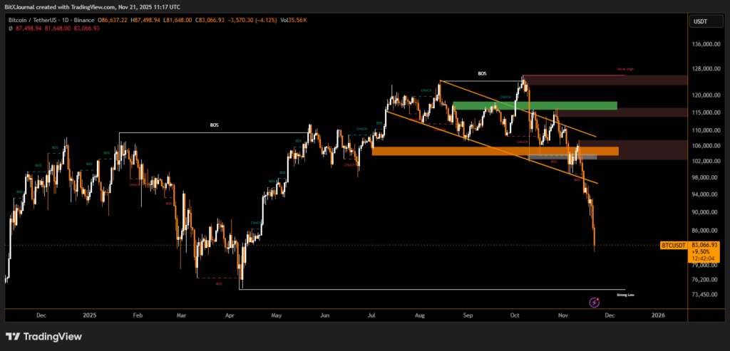 Bitcoin is currently trading just above $82,000, according to CoinMarketCap — down nearly 35% from its October record above $126,000. The broader crypto market has also retreated, with total capitalization falling to $2.84 trillion, a 33.6% decline from its peak.