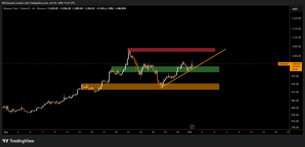 At the time of writing, BNB trades near $1,024, approaching a critical resistance area around $1,080–$1,095. A confirmed breakout above this zone could accelerate momentum toward the $1,150–$1,200 levels, marking the next bullish target.