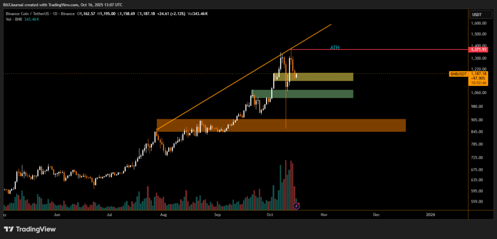 Binance Coin (BNB) has seen a notable pullback of around 11% from its recent all-time high (ATH) of $1,371, currently trading near $1,185. Despite the decline, technical charts indicate a healthy correction phase within a broader bullish structure, as traders eye multiple support zones for potential rebounds.