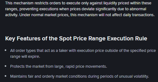 PRER ties order execution to a dynamic reference price derived from recent trades, with percentage-based bands set above and below that level. Orders attempting to fill outside the range are partially or fully canceled. Binance emphasized that this mechanism differs from user-set stop-loss or limit orders, as it is an exchange-level protection applied during order matching, independent of user intent.