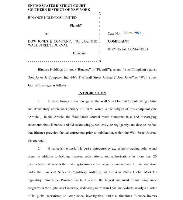 Binance has filed a defamation lawsuit against The Wall Street Journal following a February report that alleged the platform halted an internal investigation into cryptocurrency flows connected to Iranian networks.