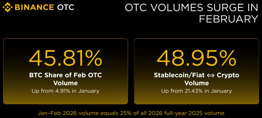 Trading activity on Binance accelerated sharply in early 2026, highlighting growing institutional interest in digital assets. According to data released through the Binance Blog, OTC trading volumes during the first two months of 2026 reached approximately 25% of the platform’s total volume recorded in 2025, reflecting increased reliance on private liquidity channels.