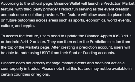 Binance is beta-testing a prediction market feature within its wallet app, partnering with third-party protocol Predict.Fun on BNB Smart Chain. Users will need to create a dedicated prediction account, separate from their spot trading account, to trade on event contracts. The rollout date and jurisdiction availability have not been announced.