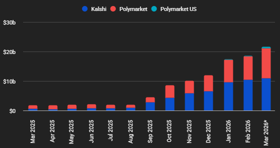 Major crypto exchanges are increasingly entering prediction markets. In January, Coinbase expanded its offering in the U.S. through Kalshi, while Crypto.com launched a standalone platform called OG before Super Bowl LX. Monthly trading volumes have surged past $20 billion, up from $1.2 billion in early 2025. In March, Kalshi recorded roughly $10.98 billion, and Polymarket $10.04 billion.