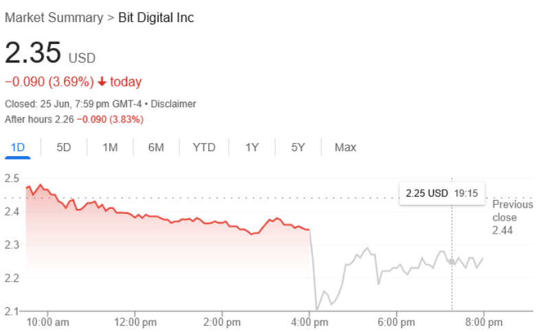 Bit Digitalâs pivot wasnât well received on Wall Street. Shares fell 3.69% to $2.35 during Wednesdayâs trading session, and dropped another 3.83% after hours, closing at $2.26, according to Google Finance.