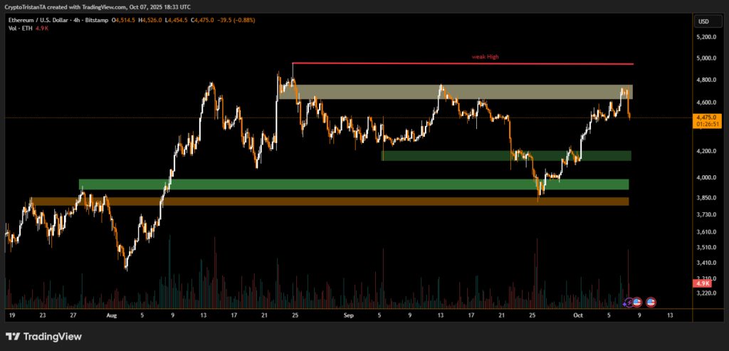 Ethereum’s 4-hour chart displays a similar setup. The price rejected near $4,800, a zone marked by heavy historical supply, and is currently retesting the $4,400–$4,350 support range. A decisive bounce from here could open the door to another push toward the $4,700 level, but a failure could trigger deeper correction toward $4,200.