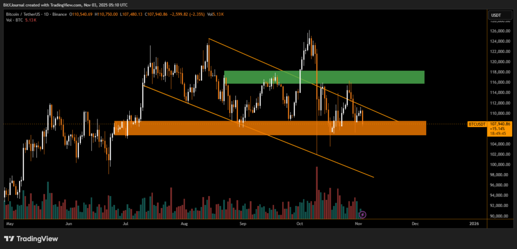On the daily chart, BTC remains in a descending channel, suggesting a possible retest of $105,000 if the orange support fails to hold. The upper resistance near $115,000–$118,000 remains the key breakout zone for any renewed bullish momentum.
