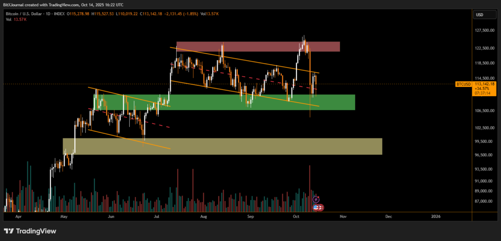 The broader sentiment flipped positive as the green demand zone held firm. Traders are closely watching for a daily close above $114,000 to confirm bullish continuation.