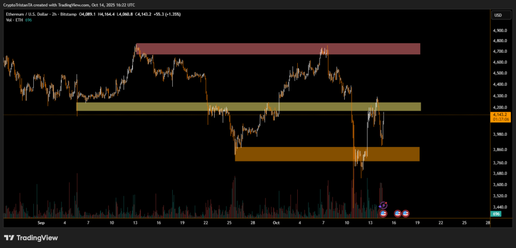 Ethereum mirrored Bitcoin’s strength, reclaiming key support near $3,850 and quickly pushing toward the $4,200 zone. The rebound aligns with a shift in risk appetite following Powell’s remarks. The chart reveals a strong bounce from a two-week demand block, with a potential retest of $4,450–$4,700 if volume sustains.