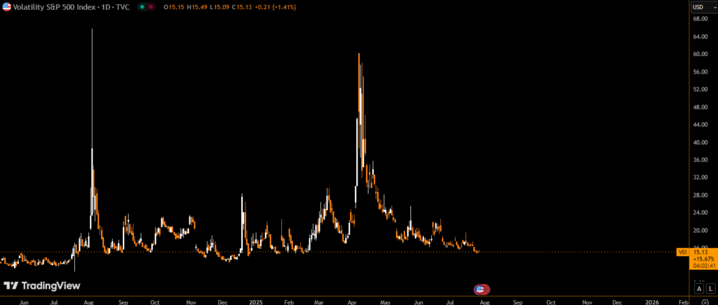 The VIX recently hit a five-month low of 14.92, marking the third straight monthly decline since peaking in April. This drop historically precedes the index’s sharp August rebound. If the pattern holds, Wall Street could be on the brink of a turbulence phase, which often spills into correlated risk markets like Bitcoin.